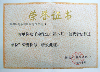 2006年3月15日,河北省消費協會為我公司頒發河北省第八屆“消費者信得過單位”證書。